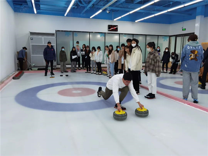 首先,北京师范大学师生一行来到国内规模最大的创新型气膜式冰球馆群——启迪冰雪体育中心。在讲解员的带领下,同学们全方位、立体式地了解了北京冬奥会场馆的建设情况及设计理念。参观结束后,共同体验冰壶项目,以“零距离”接触的方式感悟冬奥魅力。