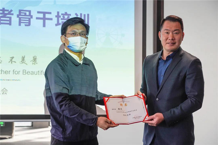首先,石景山团区委副书记于勇为张昊颁发了北京2022冬奥会石景山区城市志愿者培训导师聘书。